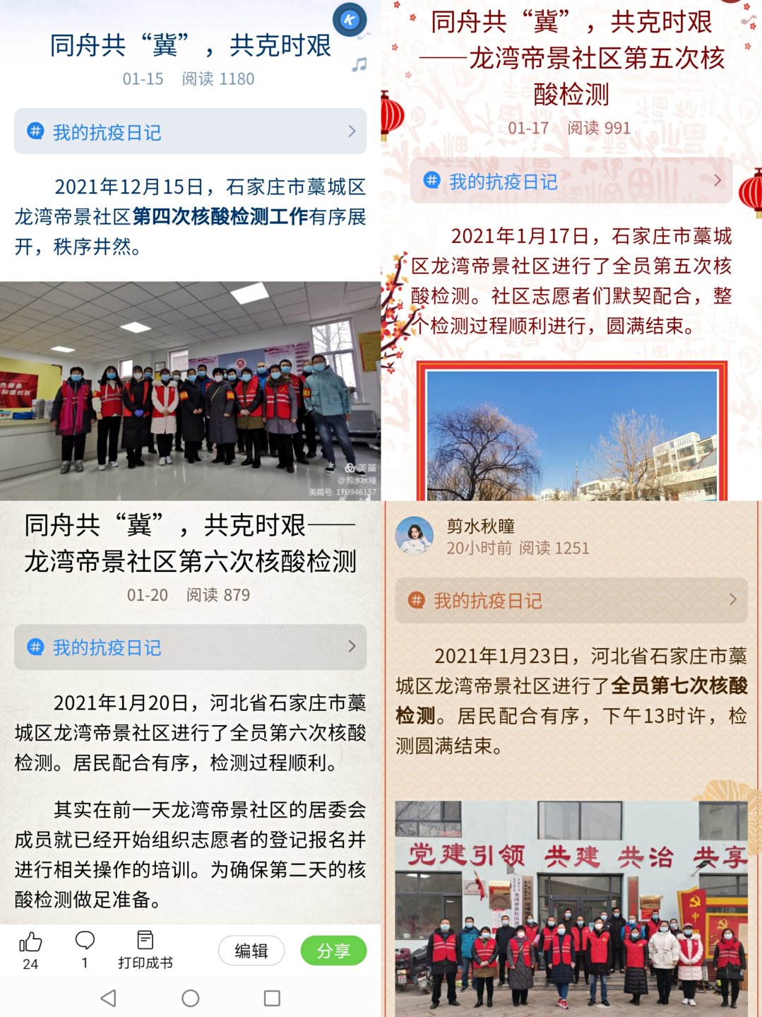“这次的疫情防控志愿者经历,截止到目前七次核酸检测过程中大家在一起工作的每一天,对我而言都是一次次成长的历练。从刚开始的手忙脚乱,挑灯夜战;到后来的默契配合,顺利高效。内心偶尔也兵荒马乱,好在常常是得心应手。我也联系了已经回乡的同学和朋友,一起加入疫情防控的志愿者队伍。北方已经进入了数九寒天,但志愿者们身上的马甲是鲜红的,志愿者们的心也是炽热的。疫情给小城笼罩上一层淡淡的阴霾,希望我们的志愿服务能多多少少为社区居民们的心头增添一丝暖意,为疫情防控做出自己的一份贡献。”