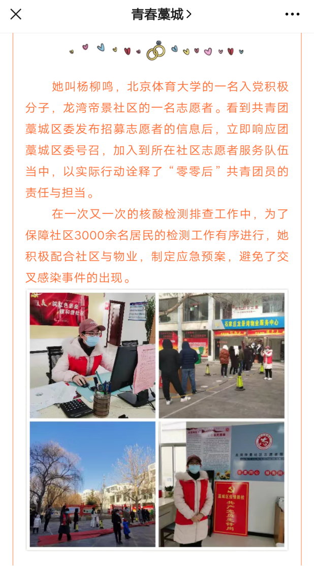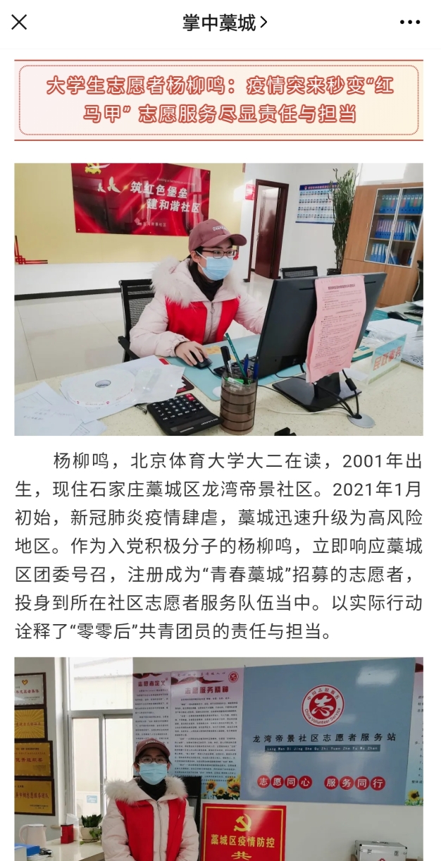 2021年1月初始,新冠肺炎疫情肆虐,藁城区迅速升级为高风险地区。作为入党积极分子的杨柳鸣,立即响应藁城区团委号召,注册成为“青春藁城”招募的志愿者,投身到所在社区志愿者服务队伍当中。以实际行动诠释了“零零后”共青团员的责任与担当。