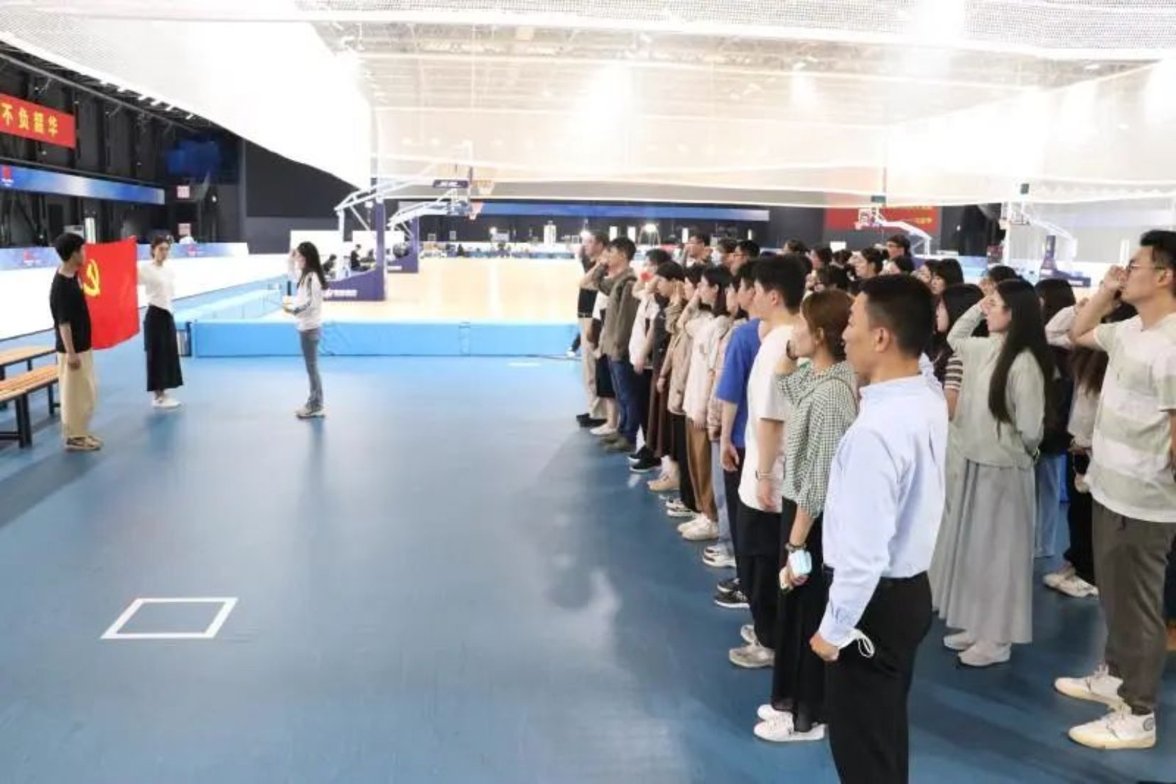 接下来,在负责人的带领下,公司一行人继续重走总书记考察之路。“同我们国家的强国之路一样,中国冰雪运动也必须走科技创新之路,一方面要坚持自主创新,一方面要善于吸收国际上的先进技术和训练方法。——习近平”从六自由度馆的多功能训练系统设施和内容到综合风洞馆的第一套实验测试风洞设备、滑雪训练风洞和风洞实验室再到阿比特室内滑雪馆再到速滑馆内全球第二套、国内首套Swiss Timing奥运计时计分及训练比赛系统和馆内设施对运动员能力提升所能起到的帮助作用,不论是训练设备还是科研设备,都给一路走来的大家带来了很多收获。在这个特殊的地方,我们重温了习近平总书记考察调研时留下的重要思想指示。在2022冬奥会与冬残奥会国家体育馆志愿者李瑾的带领下,全体党员重温入党誓词,再次回顾加入中国共产党时的心潮澎湃与坚定信念。
