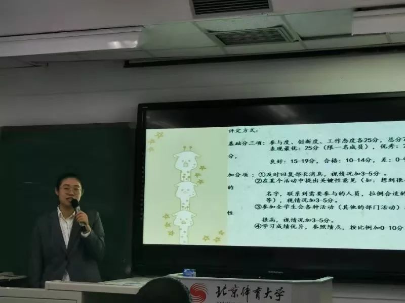 副主席王思雨详细介绍了员工会关于部员的评优标准。她着重强调了部员应该积极配合部长完成各项工作,也指出各位同学要努力学习,提高绩点,严格要求自己,不能因为员工会的工作就放低对成绩的要求。