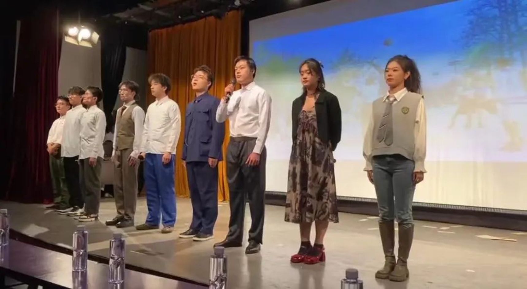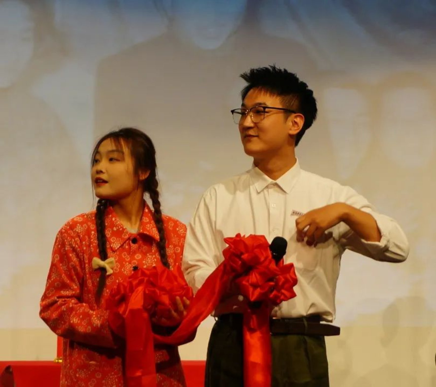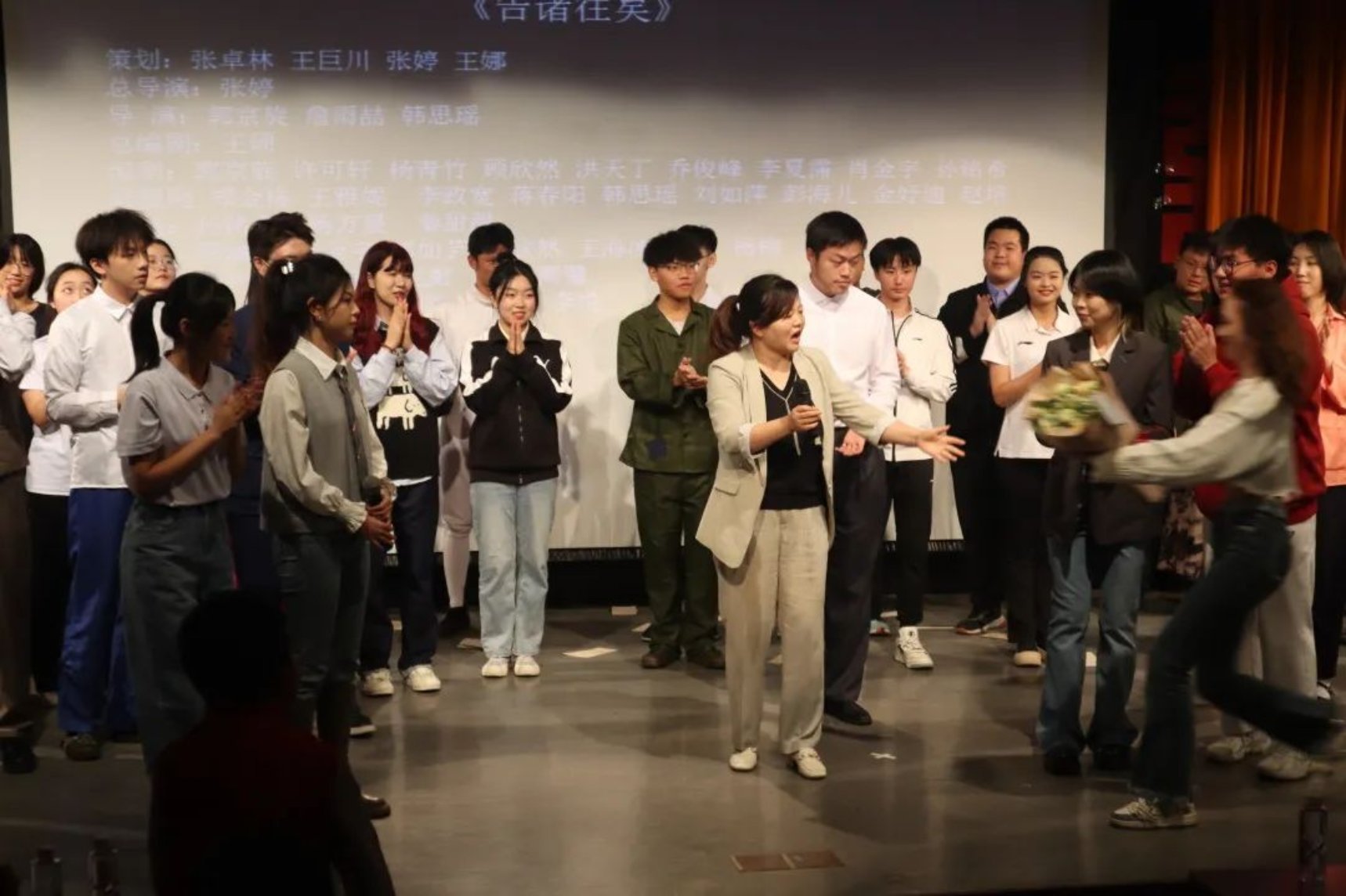 随着情真意切的朗诵《别停下来》结束,主创团队和幕后团队一批批出场谢幕。在总导演张婷老师的指挥下,现场所有同学一起向贺龙总理和钟师统经理鞠躬,向前辈致敬以表达感激。