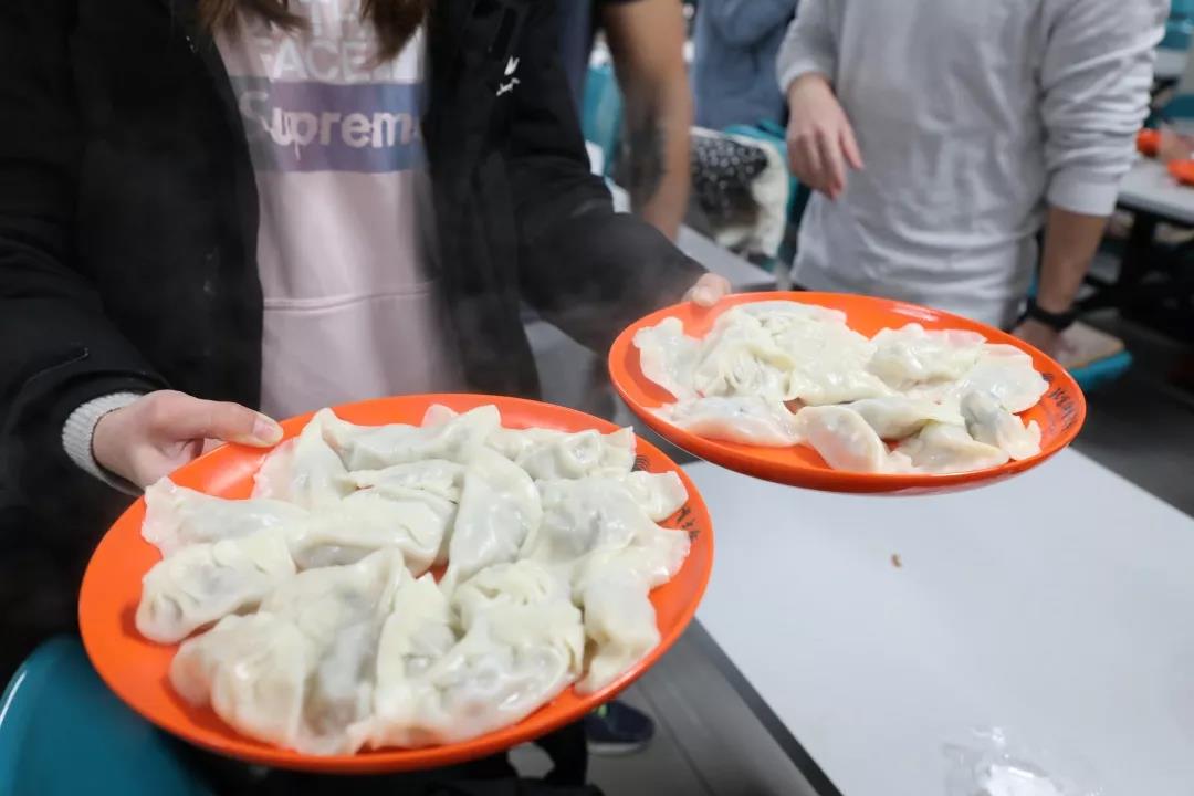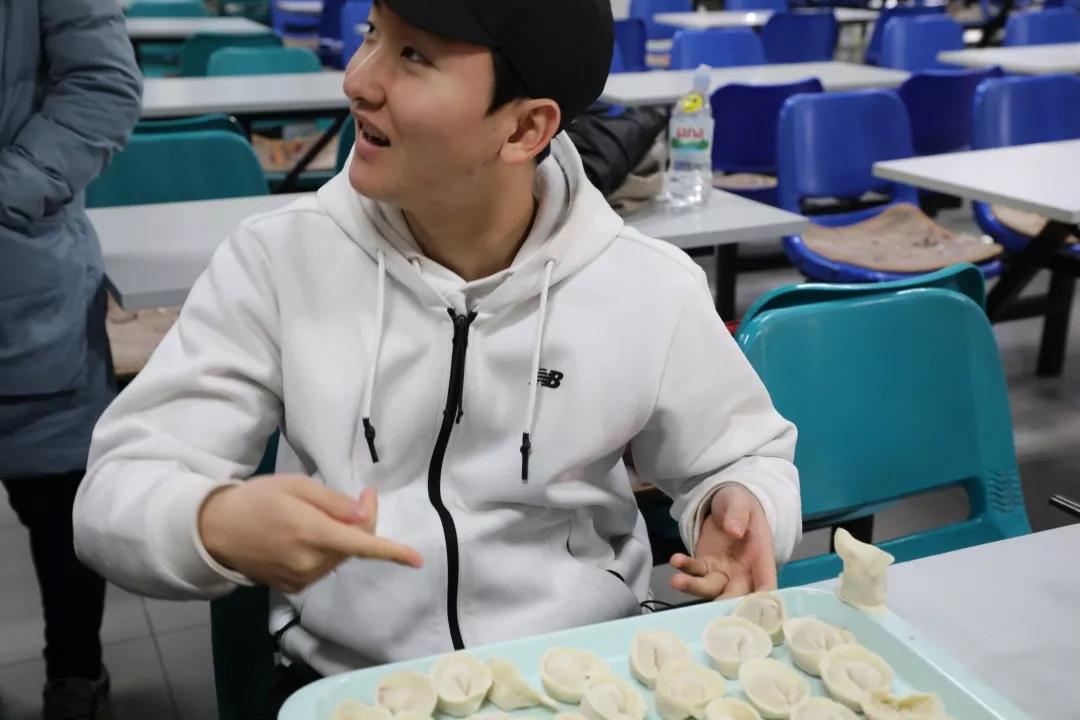 洗过手后,同学们和职工们开始撸起袖子包饺子,外国朋友们在一番观摩学习之后也动手尝试起来,不得不说,他们的动手能力真的非常强,个个包的有模有样。大家围在一起,边包边聊,交流起日常的学习和生活。